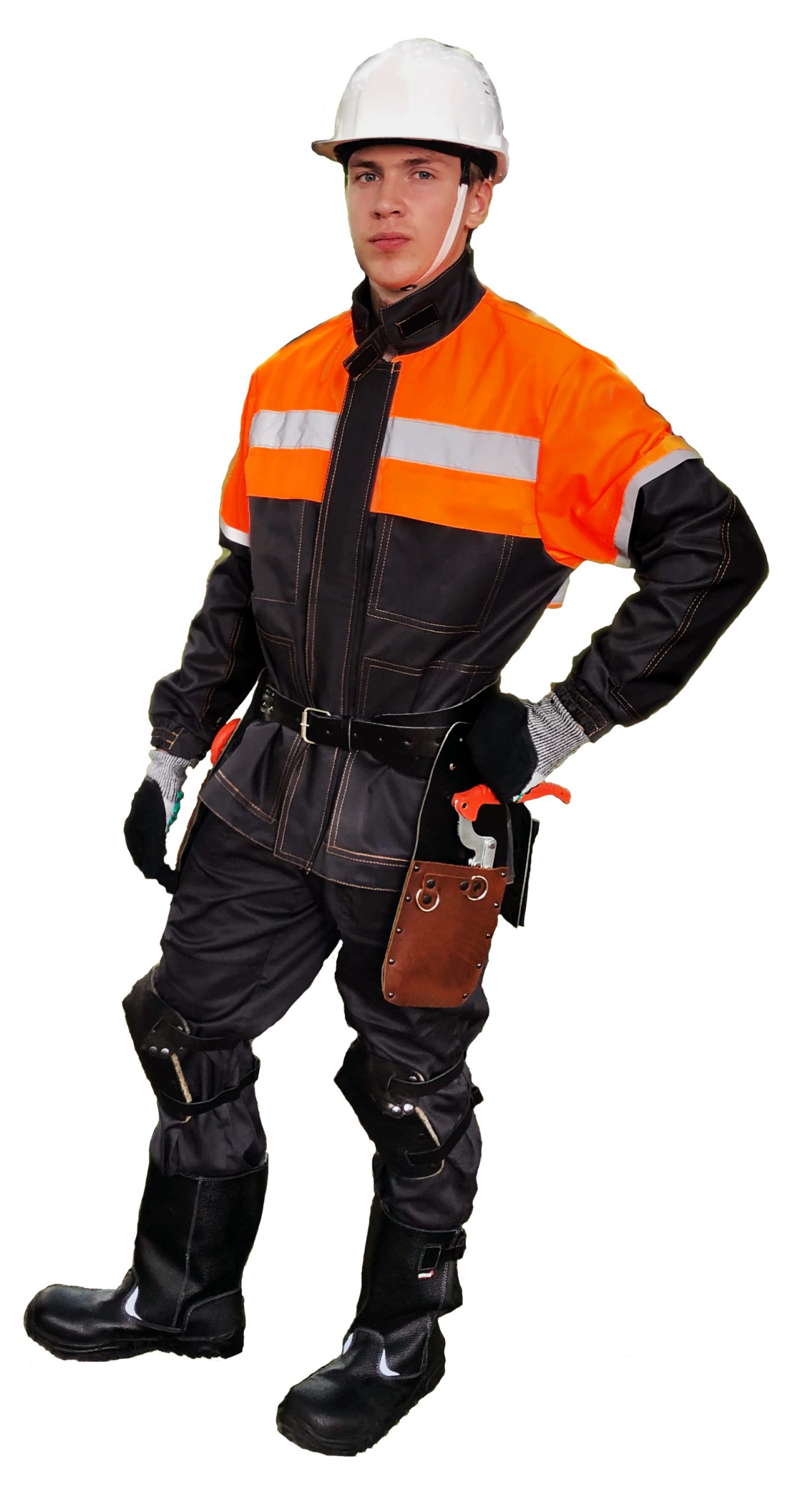 Костюм вальщика леса (куртка и полукомбинезон)  , усиленный от пропила цепи (под заказ), цвет тёмно — серый с оранжевой отделкой и чёрными налокотниками, и наколенниками