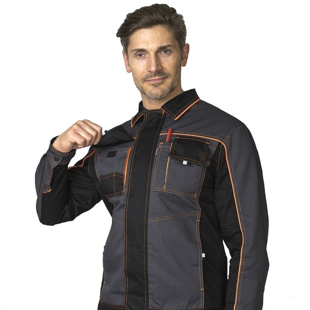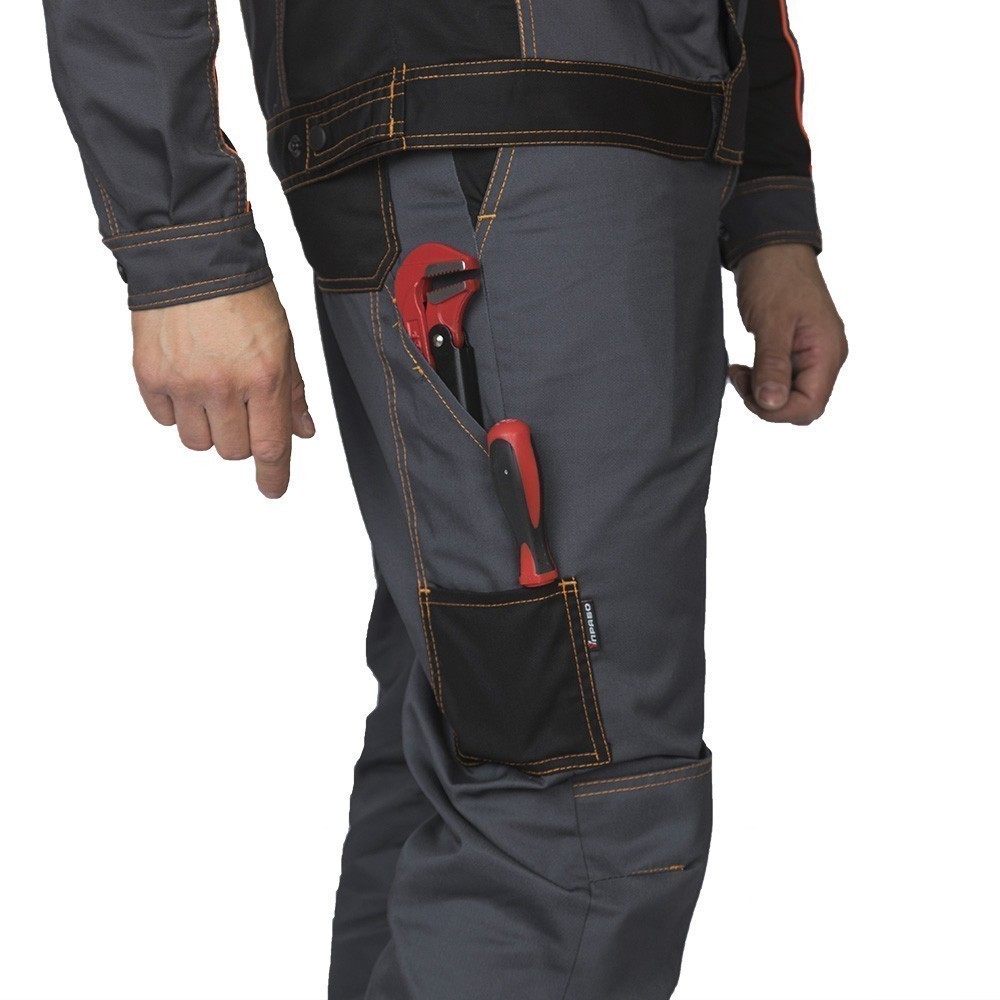 Карманы: куртка: верхние накладные с клапаном на контактной ленте, справа двойной усиленный карман с отделением для телефона и карандаша; нижние карманы с вертикальным входом. Брюки: передние с наклонным входом, задние накладные карманы, застёжка на контактную ленту, боковой фигурный накладной карман для инструментов.