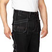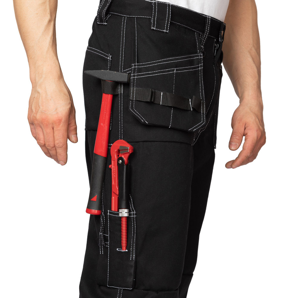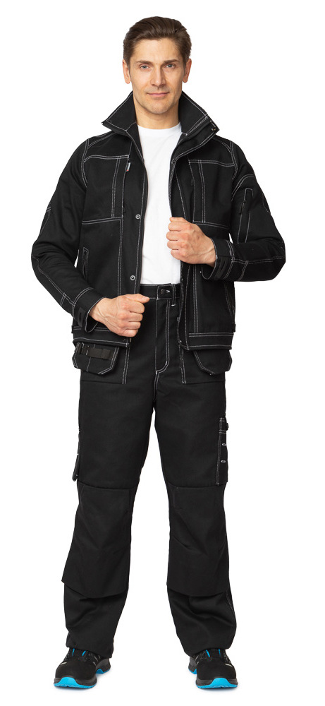 Карманы: куртка: внешние передние карманы на молнии: 2 сверху, 2 снизу, 1 карман на левом плече, размер которого позволяет разместить телефон или пропуск; на спинке куртки 2 кармана увеличенного размера — в них можно разместить документы или блокнот; 1 внутренний карман с застежкой на контакт-ленту. Брюки: передние двойные карманы предусмотрены для размещения в них инструментов — они легко достаются из внутреннего кармана, если необходимости в карманах нет — они также легко убираются; правый набедренный карман с боковыми петлями удобен для ношения столярно-слесарного инструмента, прорези обеспечивают дополнительную фиксацию негабаритных предметов; левый набедренный карман закрывается клапаном на кнопке, его можно использовать для размещения расходных материалов.