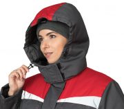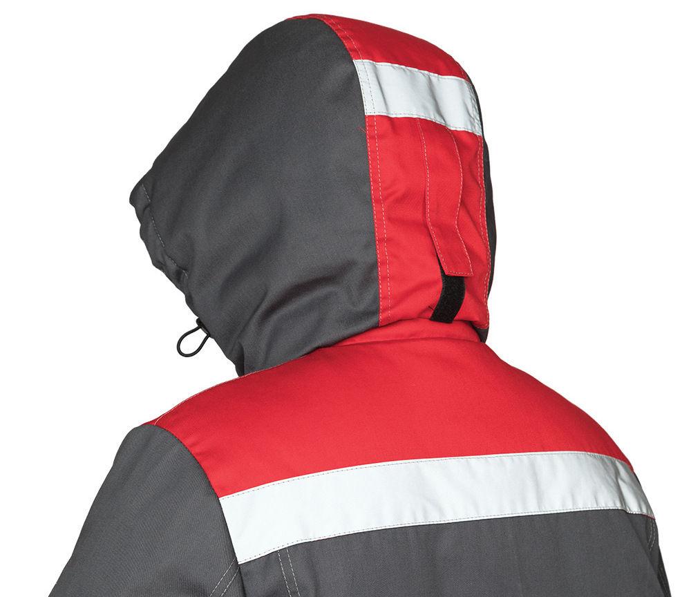 Капюшон съёмный, с притачной утеплённой подкладкой, с застёжкой на ленту контактную. На центральной части настрочена СОП шириной 50мм и хлястик, с фиксацией на ленту контактную. По лицевому вырезу капюшона эластичный шнур, продетый в кулиску. Выходы для шнура в виде люверсов. Длина шнура регулируется с помощью фиксаторов. Капюшон пристёгивается к верхнему воротнику на застежку молнию, закрытую планкой.