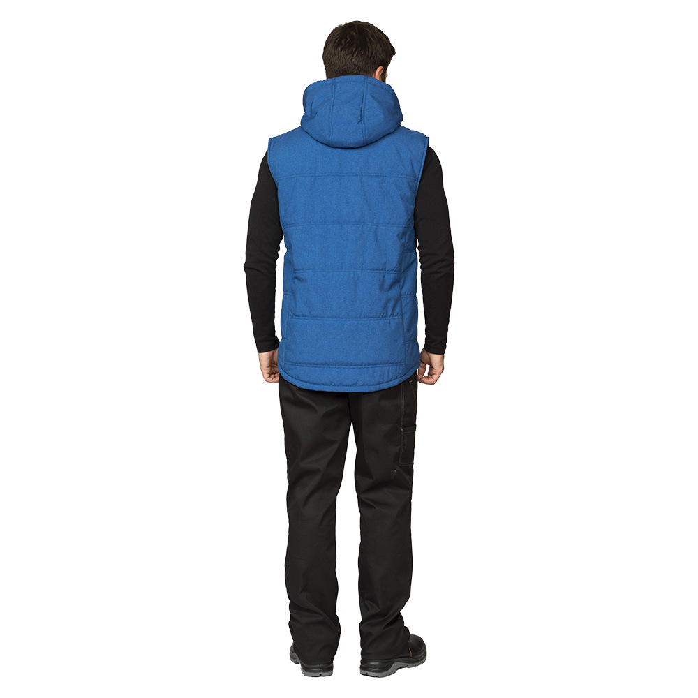 Жилет: утеплённый прямого силуэта с удлинённой спинкой, стёганный двойными горизонтальными строчками, центральная бортовая застёжка на молнию, флисовая подкладка обеспечит удобство при эксплуатации. Воротник-стойка утеплённый, внутри из флиса. На внешнем воротнике планка с кнопками для пристёгивания капюшона.