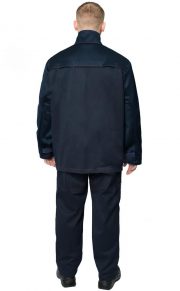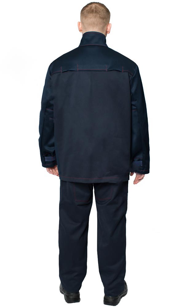 куртка: удлиненная, прямого силуэта; воротник стойка, пата для обеспечения защиты шеи; потайная застёжка на пуговицы; рукава втачные двухшовные с напульсниками и усилительными накладками, по низу расположены паты для дополнительной регулировки ширины; внутренним нагрудным карманом для документов, нижними карманами в швах; отверстиями для воздухообмена под проймами и кокеткой спинки; куртка изготовлена из огнестойкой ткани, что обеспечивает высокую степень защиты от искр, брызг и окалин расплавленного металла, теплового излучения и контакта с нагретыми поверхностями; швы просрочены прочной огнестойкой нитью; куртка костюма закрывает верхнюю часть брюк.
