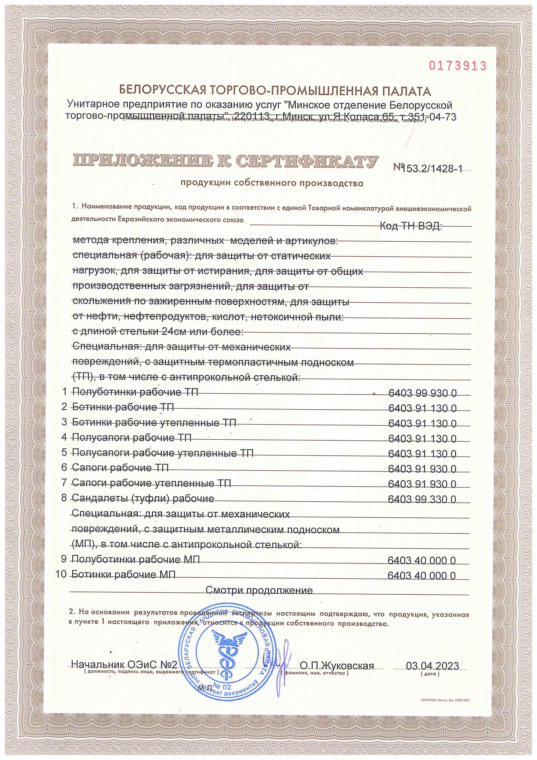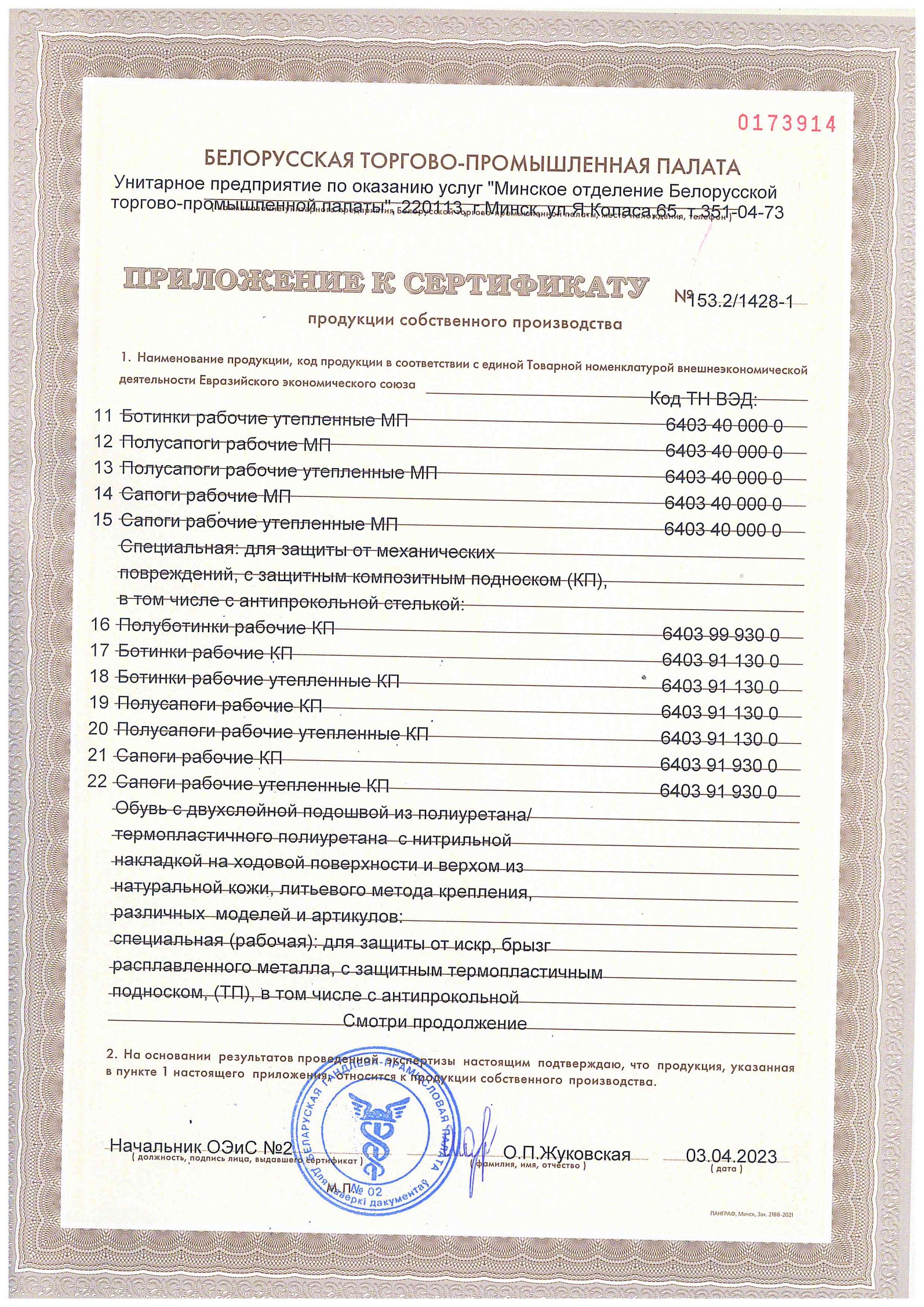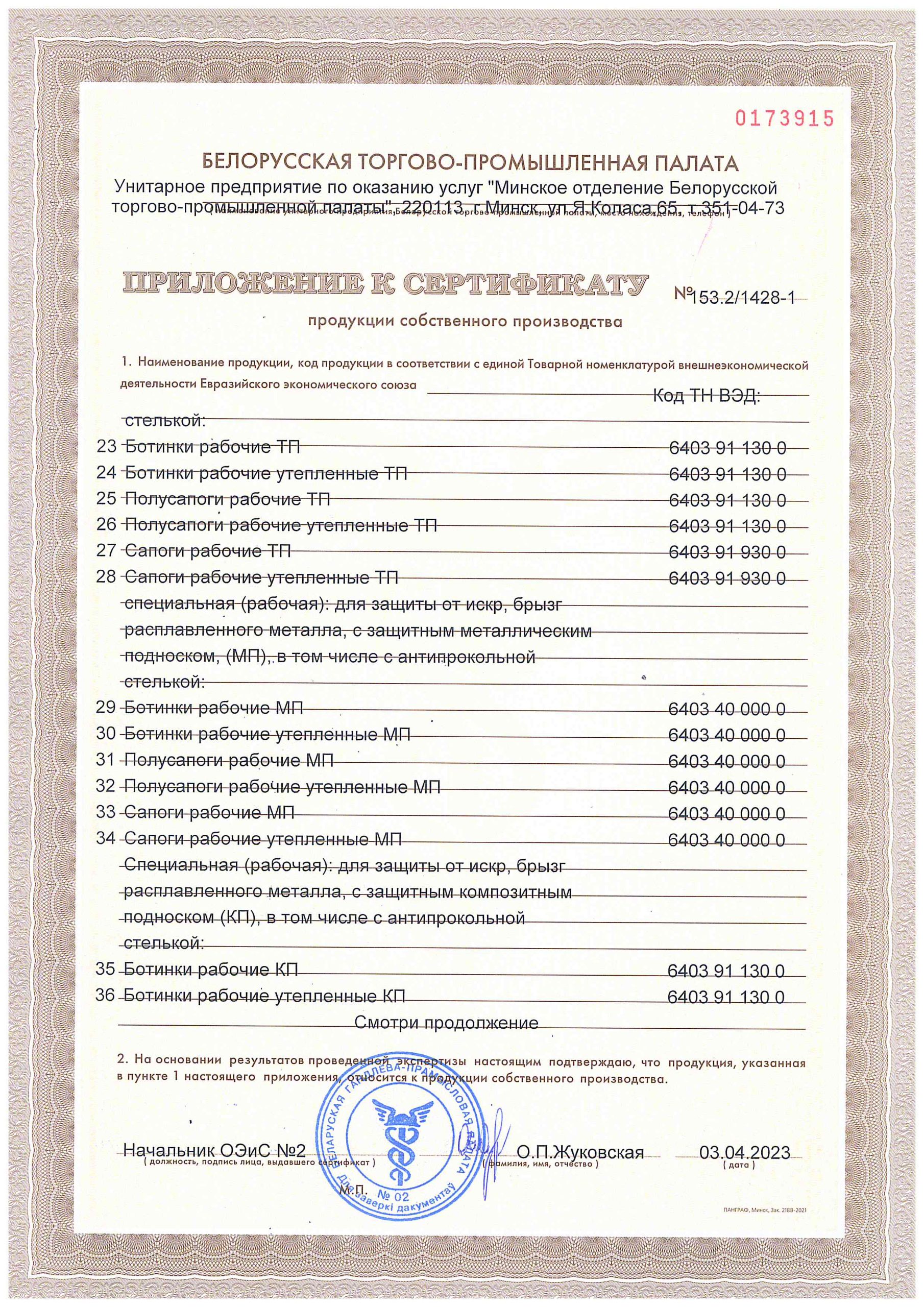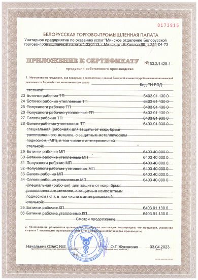 Приложение к сертификату продукции собственного производства